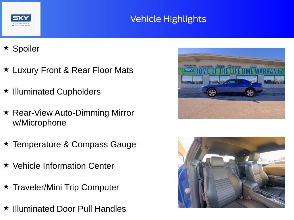 5.7L 8-Cylinder SMPI OHV, 276 Watt Amplifier, Alloy wheels, Automatic Headlamps, Brake assist, Electronics Convenience Group, Heated Front Seats, Illuminated Cupholders, Illuminated Door Pull Handles, Instrument Cluster w/Display Screen, Keyless Enter-N-Go, Leather Shift Knob, Leather Trimmed Bucket Seats, Luxury Front & Rear Floor Mats, Power Heated Fold-Away Mirrors, Quick Order Package 28J (DISC), Rear window defroster, Rear-View Auto-Dimming Mirror w/Microphone, Remote keyless entry, Security Alarm, SIRIUS Satellite Radio, Split folding rear seat, Spoiler, Steering Wheel Mounted Audio Controls, Temperature & Compass Gauge, Tire Pressure Monitoring Display, Traveler/Mini Trip Computer, UConnect Hands-Free Communication, Universal Consumer Interface (UCI), Universal Garage Door Opener, Vehicle Information Center. Deep Water Blue PC/Light Graystone PC 2009 Dodge Challenger R/T RWD 5-Speed Automatic 5.7L 8-Cylinder SMPI OHV