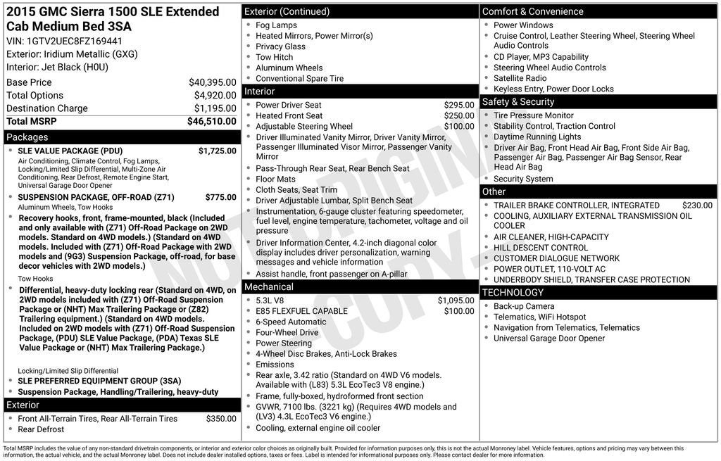 6-Speed Automatic Electronic with Overdrive, 4WD, Black Cloth, 10-Way Power Driver's Seat Adjuster, 110-Volt AC Power Outlet, 150 Amp Alternator, 4.2 Diagonal Color Display Driver Info Center, Black Alloy Wheels, Body Color Bodyside Moldings, Body Color Door Handles, Body Color Power-Adjustable Heated Outside Mirrors, Body-Color Mirror Caps, Brake assist, Chrome Grille Surround, Color-Keyed Carpeting w/Rubberized Vinyl Floor Mats, Deep-Tinted Glass, Driver & Front Passenger Illuminated Vanity Mirrors, Dual-Zone Automatic Climate Control, Electric Rear-Window Defogger, Electronic Autotrac Transfer Case, Exterior Parking Camera Rear, EZ Lift & Lower Tailgate, Front Frame-Mounted Black Recovery Hooks, Front Halogen Fog Lamps, Heated door mirrors, Heated Driver & Front Passenger Seats, Heavy-Duty Rear Locking Differential, Hill Descent Control, Leather Wrapped Steering Wheel w/Cruise Controls, LED Cargo Box Lighting, Manual Tilt Wheel Steering Column, OnStar 6 Months Directions & Connections Plan, OnStar w/4G LTE, Power Windows w/Driver Express Up & Down, Preferred Equipment Group 3SA, Rear 60/40 Folding Bench Seat (Folds Up), Rear Vision Camera w/Dynamic Guide Lines, Rear Wheelhouse Liners, Remote Keyless Entry, Remote Vehicle Starter System, Single Slot CD/MP3 Player, Single-Zone Air Conditioning, SLE Value Package, Split folding rear seat, Steering wheel audio controls, Steering Wheel Audio Controls, Trailering Equipment, Universal Home Remote, Z71 Off-Road Suspension Package.