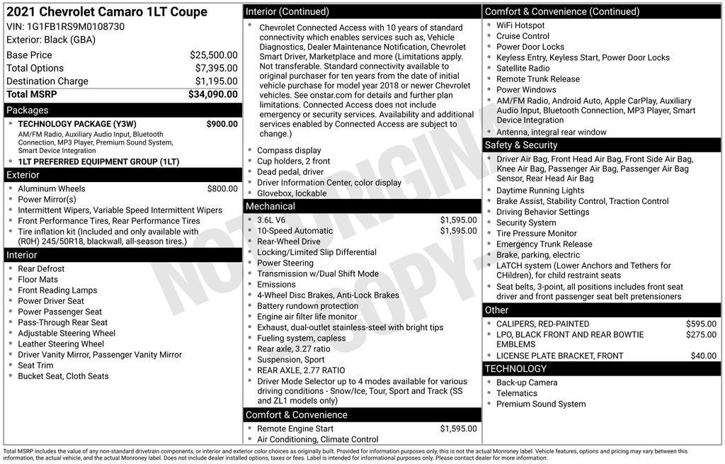 Apple CarPlay/Android Auto, Black Alloy Wheels, Bose Premium 9-Speaker Audio System Feature, Brake assist, Exterior Parking Camera Rear, Leather Shift Knob, Preferred Equipment Group 1LT, Radio: Chevrolet Infotainment 3 Plus System, Rear window defroster, Remote keyless entry, Remote Vehicle Starter System, Steering wheel audio controls, Technology Package.
