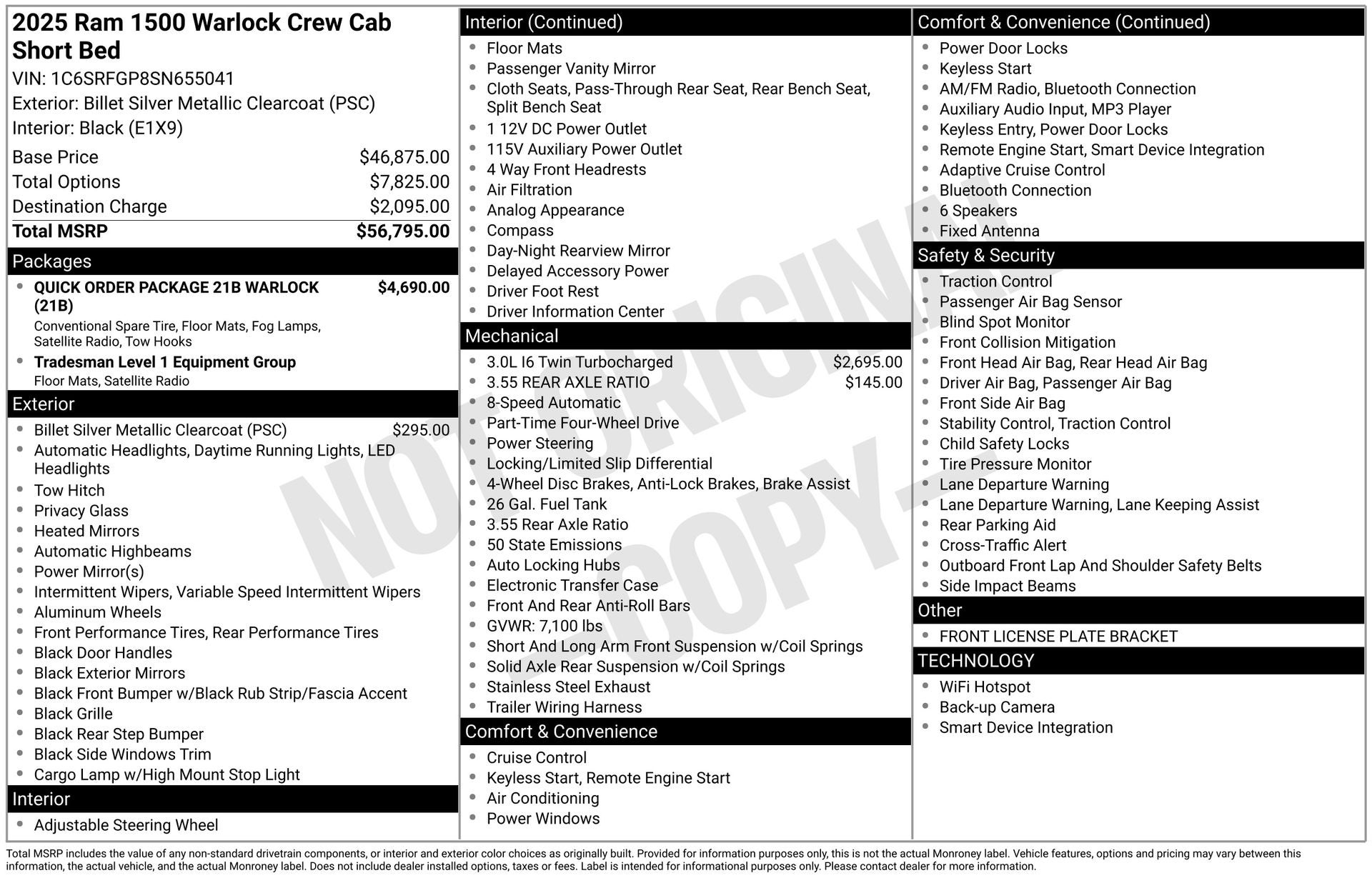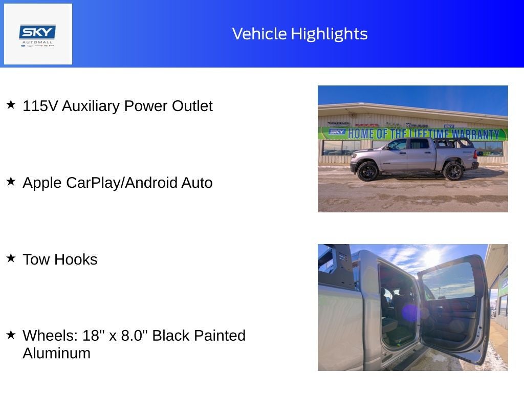 115V Auxiliary Power Outlet, Apple CarPlay/Android Auto, Brake assist, Cluster 7.0 TFT Color Display, Dual Exhaust w/Black Tips, E-Locker Rear Axle, Front LED Fog Lamps, Front Performance Tuned Shock Absorbers, Heated door mirrors, MOPAR Front & Rear Rubber Floor Mats, ParkView Rear Back-Up Camera, Quick Order Package 21B Warlock, Raised Ride Height, Rear Performance Tuned Shock Absorbers, Remote keyless entry, Selec-Speed Control, Tow Hooks, Tradesman Level 1 Equipment Group, Warlock Decal, Wheels: 18 x 8.0 Black Painted Aluminum. Billet Silver Metallic Clearcoat 2025 Ram 1500 Warlock 4WD 8-Speed Automatic 3.0L I6