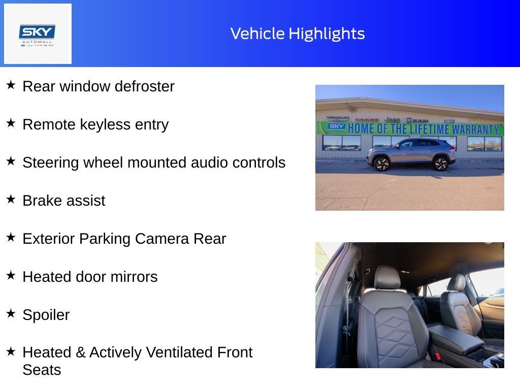 Alloy wheels, Brake assist, Exterior Parking Camera Rear, Heated & Actively Ventilated Front Seats, Heated door mirrors, Heated front seats, Heated steering wheel, Rear window defroster, Remote keyless entry, Split folding rear seat, Spoiler, Steering wheel mounted audio controls, Ventilated front seats. Gray 2025 Volkswagen Atlas Cross Sport 2.0T SE w/Technology AWD 8-Speed Automatic with Tiptronic 2.0L TSI